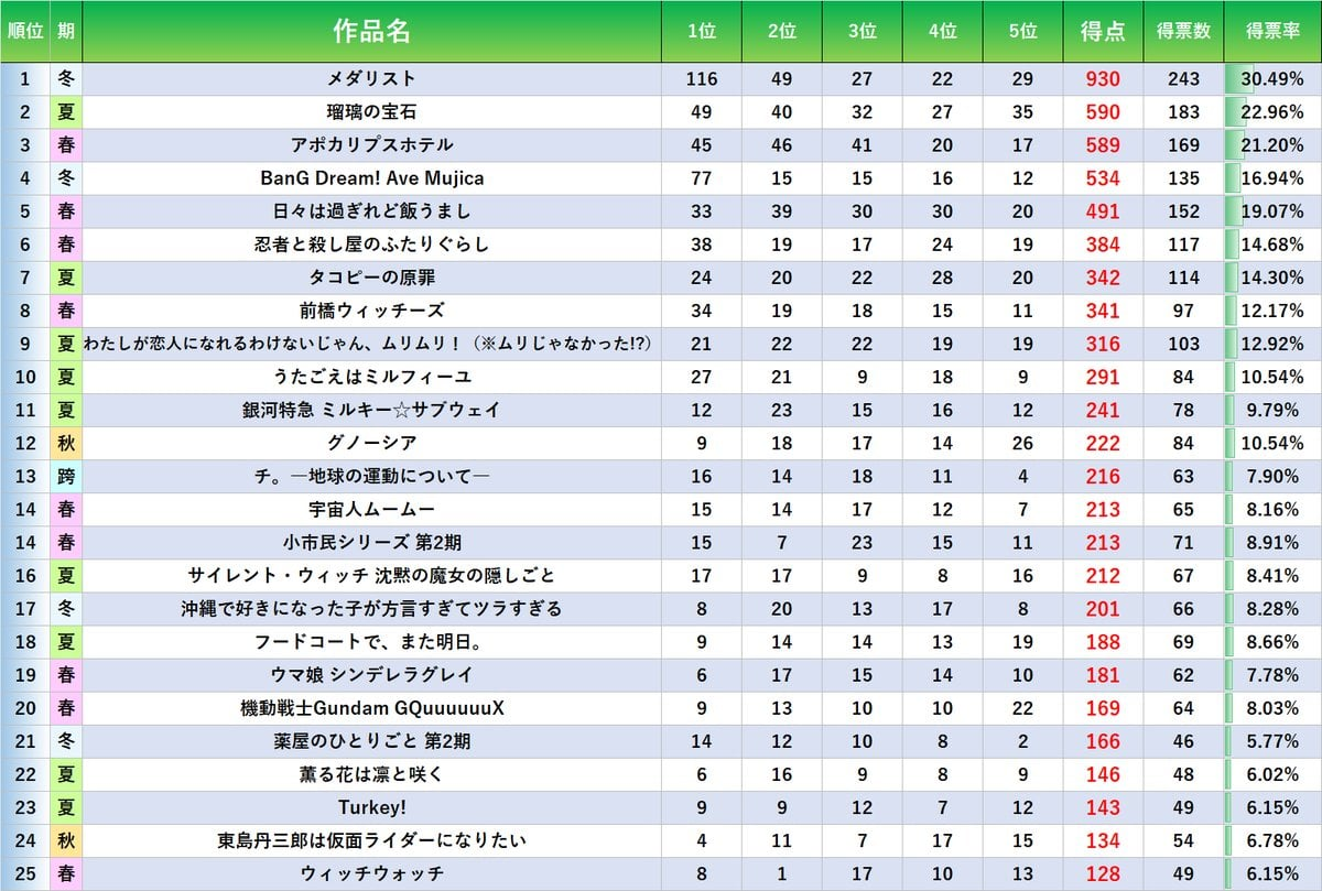 因為當時動畫討論度非常高,2005年初肯定很多人認為Ave Mujica會是霸權(前作MYGO就是2023年的第一名),但是Ave Mujica問題很明顯,劇情各種八點檔展開,就只有拿到第四名。